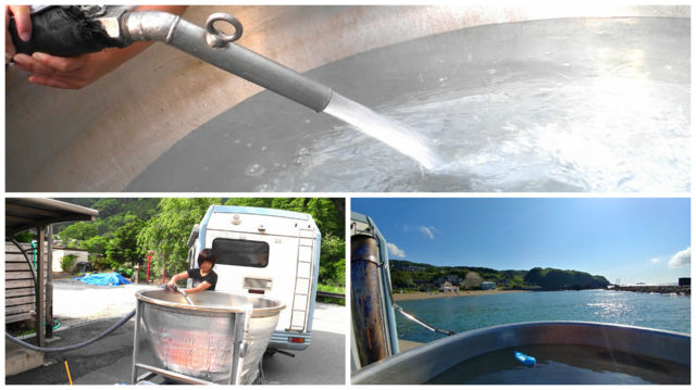 温泉スタンドで温泉を入れて、海まで持って行きました~♪